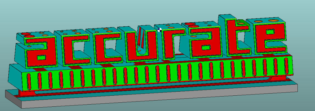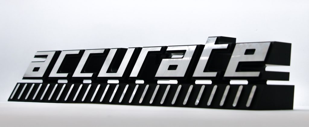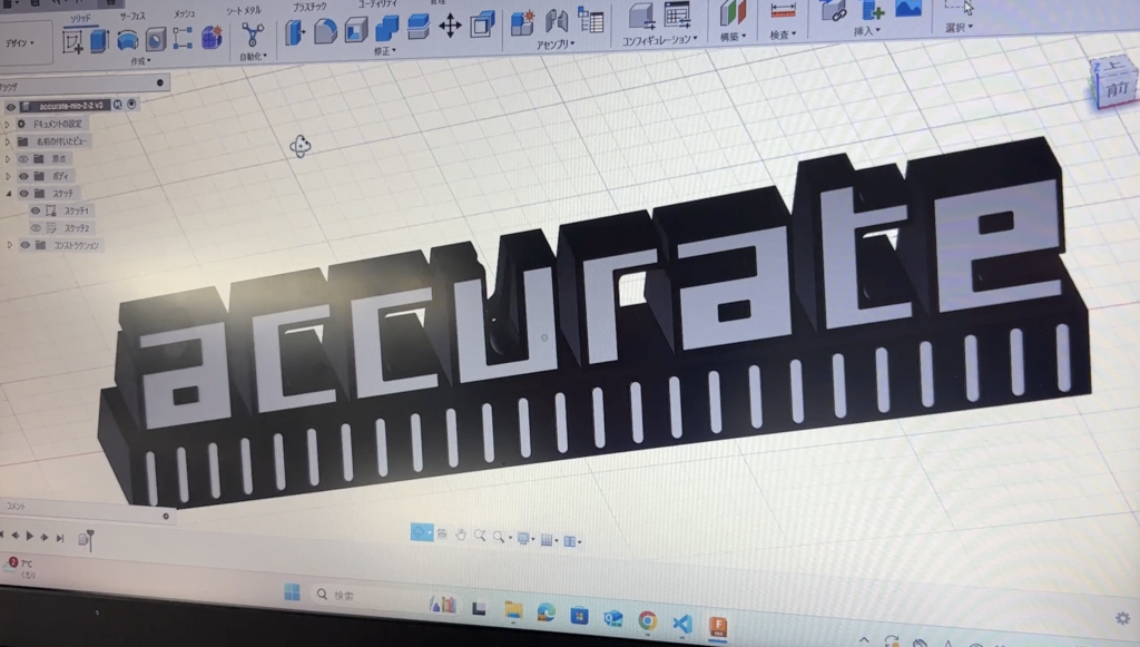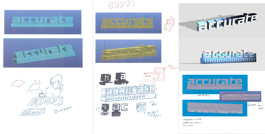 「accurate」の字がしっかりと認識できるよう角度をつけ、元のロゴバランスを一切変えないデザイン+審美性+特別な刃物を使わなくても加工ができるデザインの両立をしたことです。普段のプログラマーとしての知識で特別な刃物は加工条件の設定が難しく加工者の負担になる・仕上がりの読めなさや悪さにつながるため、そういった点に配慮ができました。鑑賞するだけでなくお客様が実際に展示会で使用するものなので、文字配置などの情報の取り入れやすさにも気をつけて設計しています。